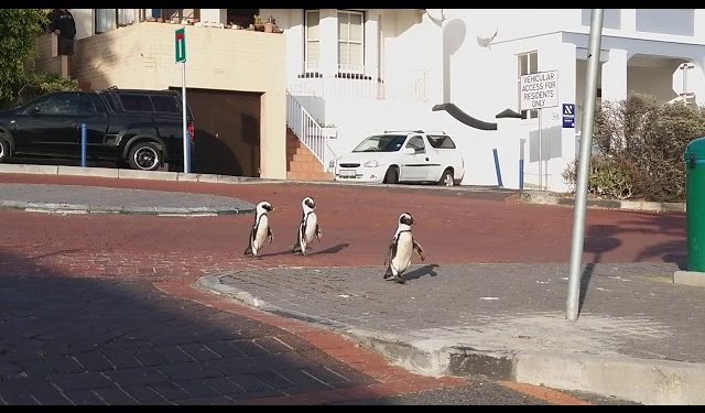 Ahora a la tendencia se han unido también los pingüinos, atraídos por las calles vacías de una localidad de Sudáfrica. Las valientes aves se pasearon despreocupadas tanto por vías de tránsito que estos días carecen de coches, como por las aceras, tendiendo finalmente a la opción peatonal.