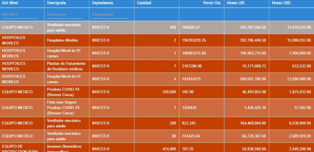 De acuerdo a la información revelada en el portal de transparencia de la secretaría de finanzas de Honduras, hasta el 15 de abril de habían ejecutado L 2,949,140,465.4 entre las 4 instituciones que están al frente de la emergencia por COVID19.