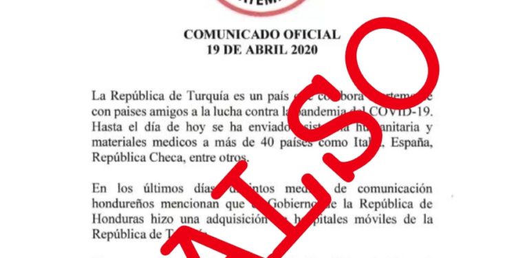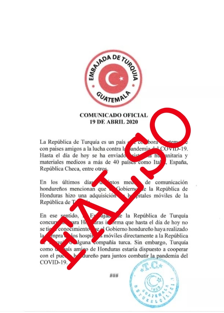 En la cuenta de twitter de la embajada de Turquía en Guatemala, fue posteado un comunicado en el que dicho país asegura desconocer que Honduras comprara hospitales móviles a alguna empresa turca o directamente a Turquía.