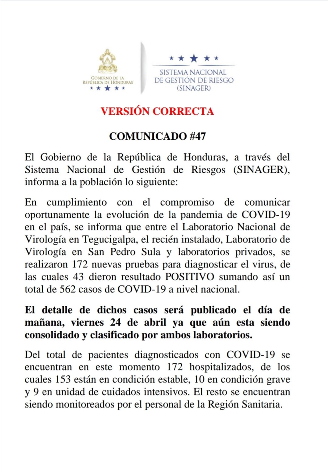 El Sistema Nacional de Gestión de Riesgo confirmó este jueves 43 nuevos casos positivos de 172 pruebas realizadas y suman en total 562 a nivel nacional y 50 personas recuperadas.