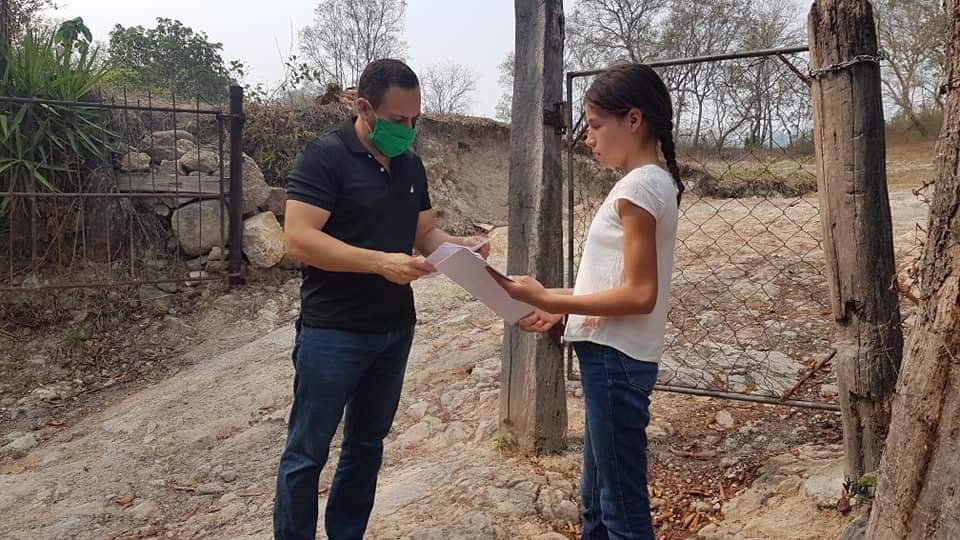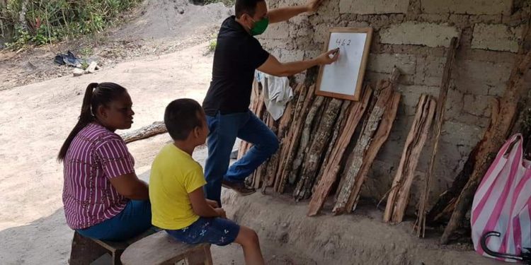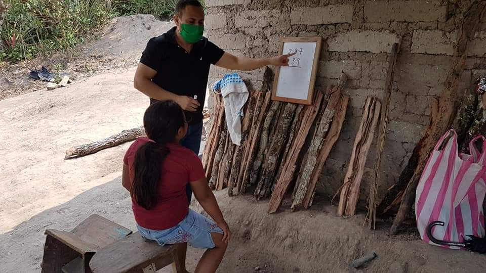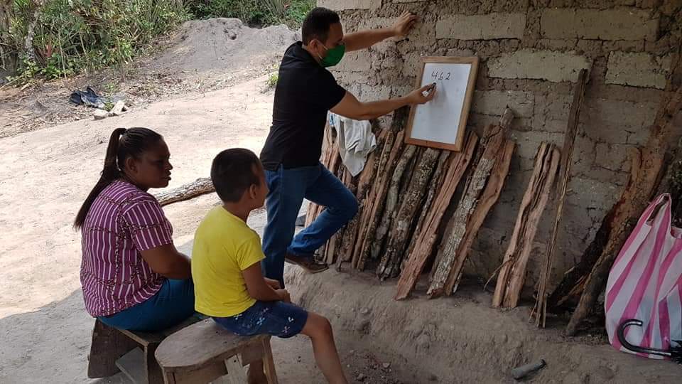 De casa en casa salió hoy el maestro Enrri Flores a brindar el pan del saber en aldea El Rodeó Mejocote acompañado de su compañera de labores de la Escuela Renacer en Gracias Lempira.
