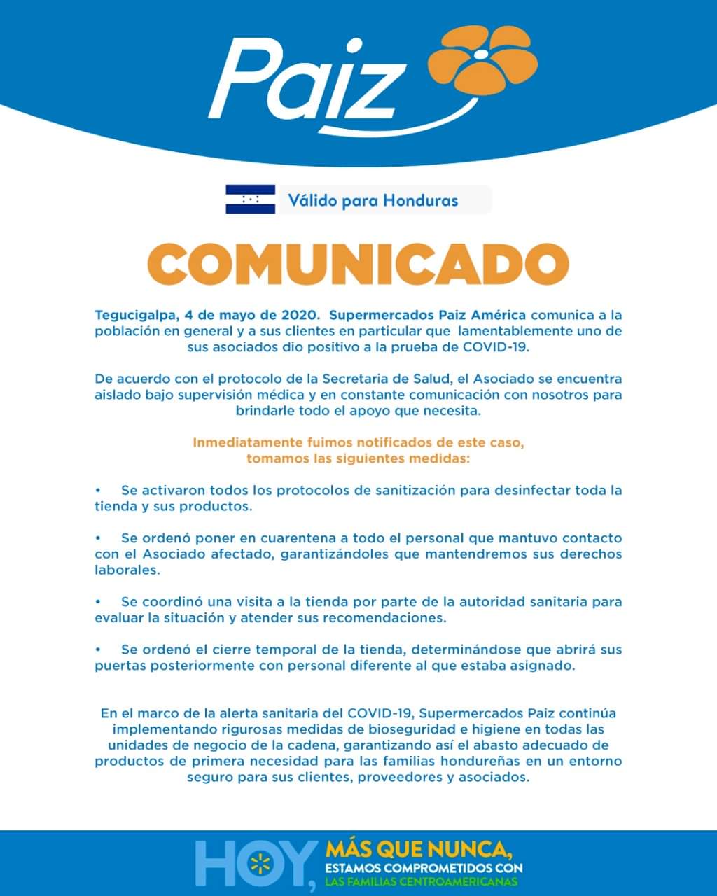 Supermercado Paiz dio a conocer este lunes a través de un comunicado que uno de sus empleados dio positivo por covid-19, asimismo el comunicado reza que decenas de colaboradores que estuvieron en contacto con el afectado estarán en cuarentena.