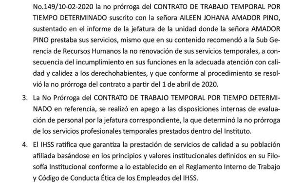 Instituto Hondureño de Seguridad Social en relación a la no renovación del contrato temporal de la enfermera auxiliar Aileen Amador.
