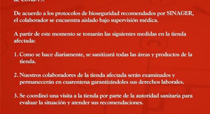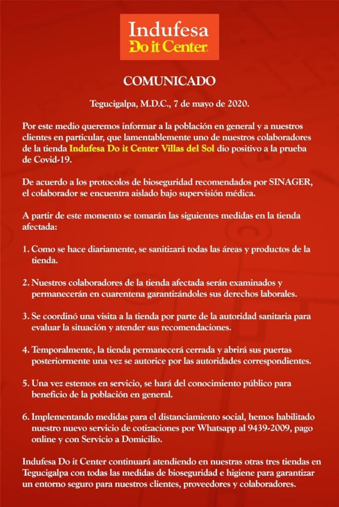 Este jueves una ferretería reconocida dio a conocer por medio de un comunicado que uno de sus colaboradores dio positivo por covid-19 en la tienda ubicada en Villas del Sol.