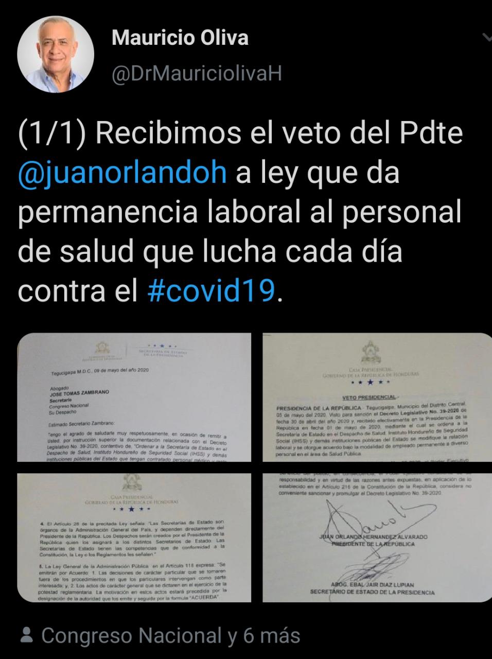 El titular del Congreso Nacional, Mauricio Oliva, dio a conocer este martes, que recibió por parte del presidente Juan Orlando Hernández, el veto a la ley que daba permanencia al personal medico que enfrenta actualmente la pandemia.