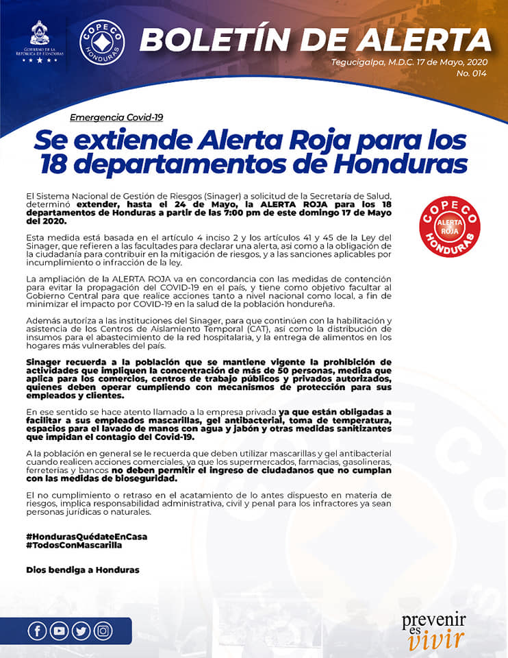 El Sinager, a solicitud de la Secretaría de Salud, también determinó extender hasta el domingo 24 de mayo, la Alerta Roja en los 18 departamentos de Honduras a partir de la 7:00 pm del domingo 17 de mayo de 2020.