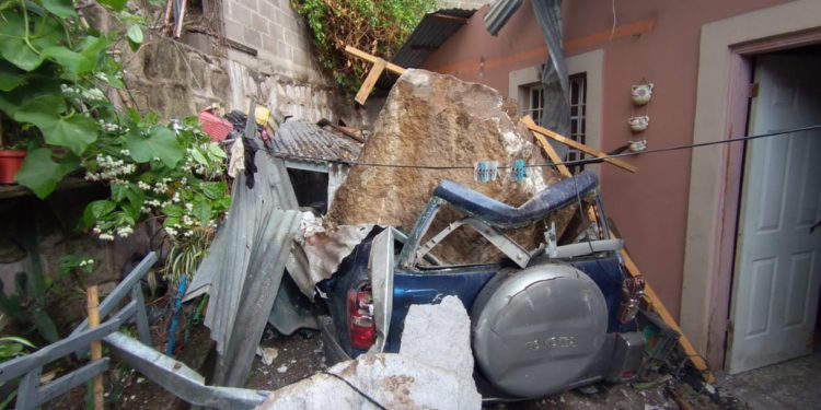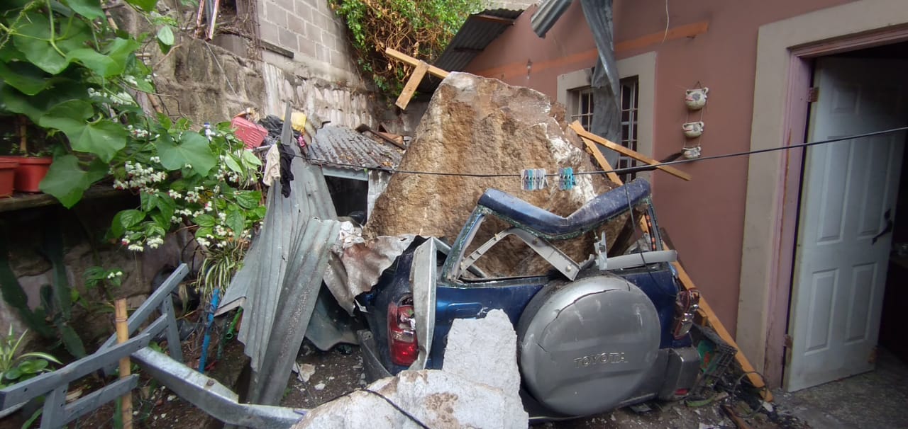 Tras fuertes lluvias de anoche, enorme roca cae sobre un vehículo en la colonia San Francisco en Comayagüela, afortunadamente solo se reportan daños materiales.