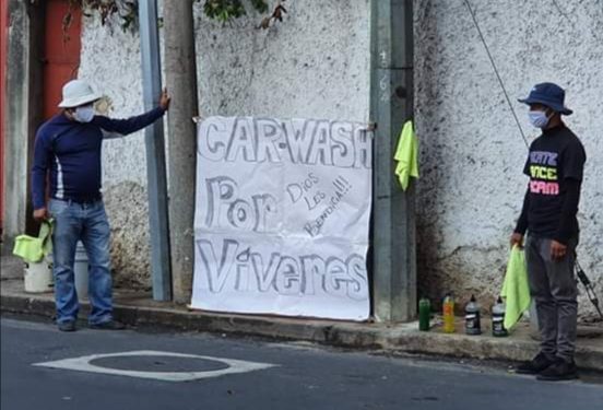Ante la crisis económica por la pandemia del coronavirus dos jóvenes han decidido lavar carros a la altura del boulevar Morazán en Teguciglapa a cambio de víveres para ellos y sus familias.