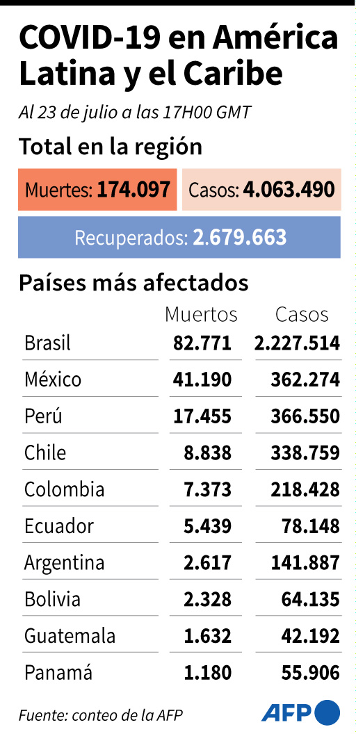 Julio 23 de 2020- Brasil sigue encabezando la lista de los diez países más azotados por la pandemia de coronavirus en América Latina con más de 82.000 muertes y 2.227.519 contagios a la fecha. Le sigue México con más de 362,000 infectados y 41,000 muertos. En tercer lugar está Perú.