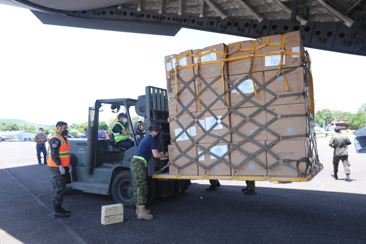 Un avión C17 Globe Master de Canadá arribó hoy al aeropuerto Toncontín, de Tegucigalpa, con el cargamento distribuido en 1,994 cajas que contenían: 636,740 mascarillas, 154,000 respiradores, 31,700 protectores y 600,000 mascarillas médicas.
